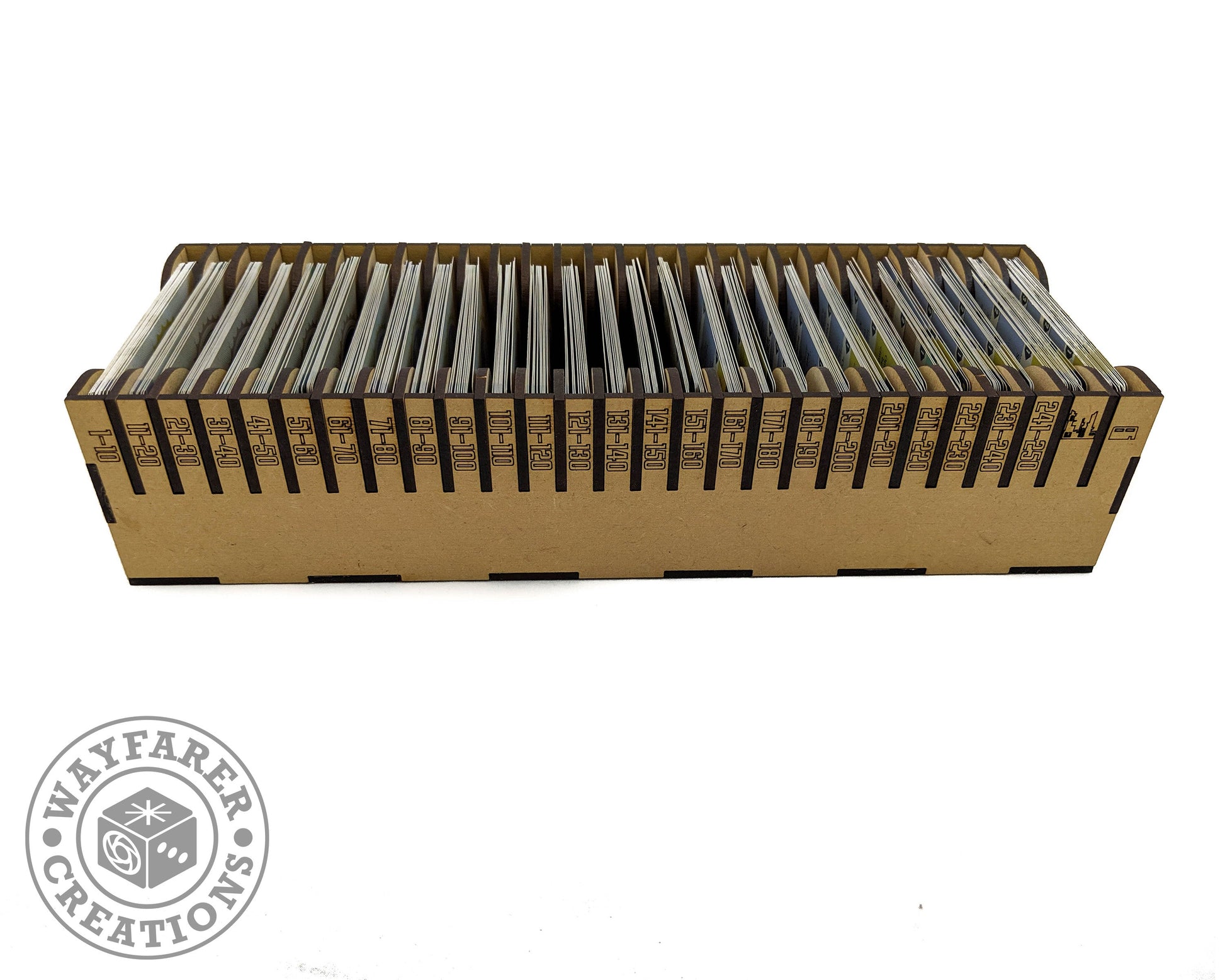 Tested with Games Plus Brand sleeves to work with either sleeved or unsleeved cards. With the Atomics Bonds update, it is no longer possible to store the smaller cards sleeved with dividers.